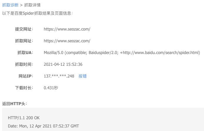可以看到,資源平臺在抓取詳情中顯示了百度解析的IP地址,SEO可以清楚地知道百度是否開始抓取新IP。如果更改域名服務(wù)器3天后百度還是解析到舊IP,就要仔細(xì)檢查域名服務(wù)器的設(shè)置了。